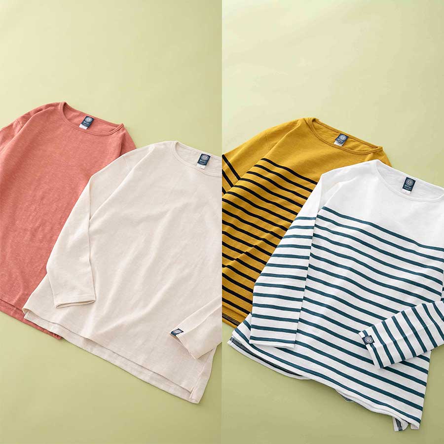 石巻の名物海産物「鯖」「雲丹」「鮭」「牡蠣」を表現したカラーが展開される。ユニセックスで2サイズを展開し。体格の良い漁師から役場で働く女性方まで多くの人にフィットするようオーバーサイズに仕上げられている。無地が1万1,880円(税込)、ボーダーが1万2,980円(税込)。
