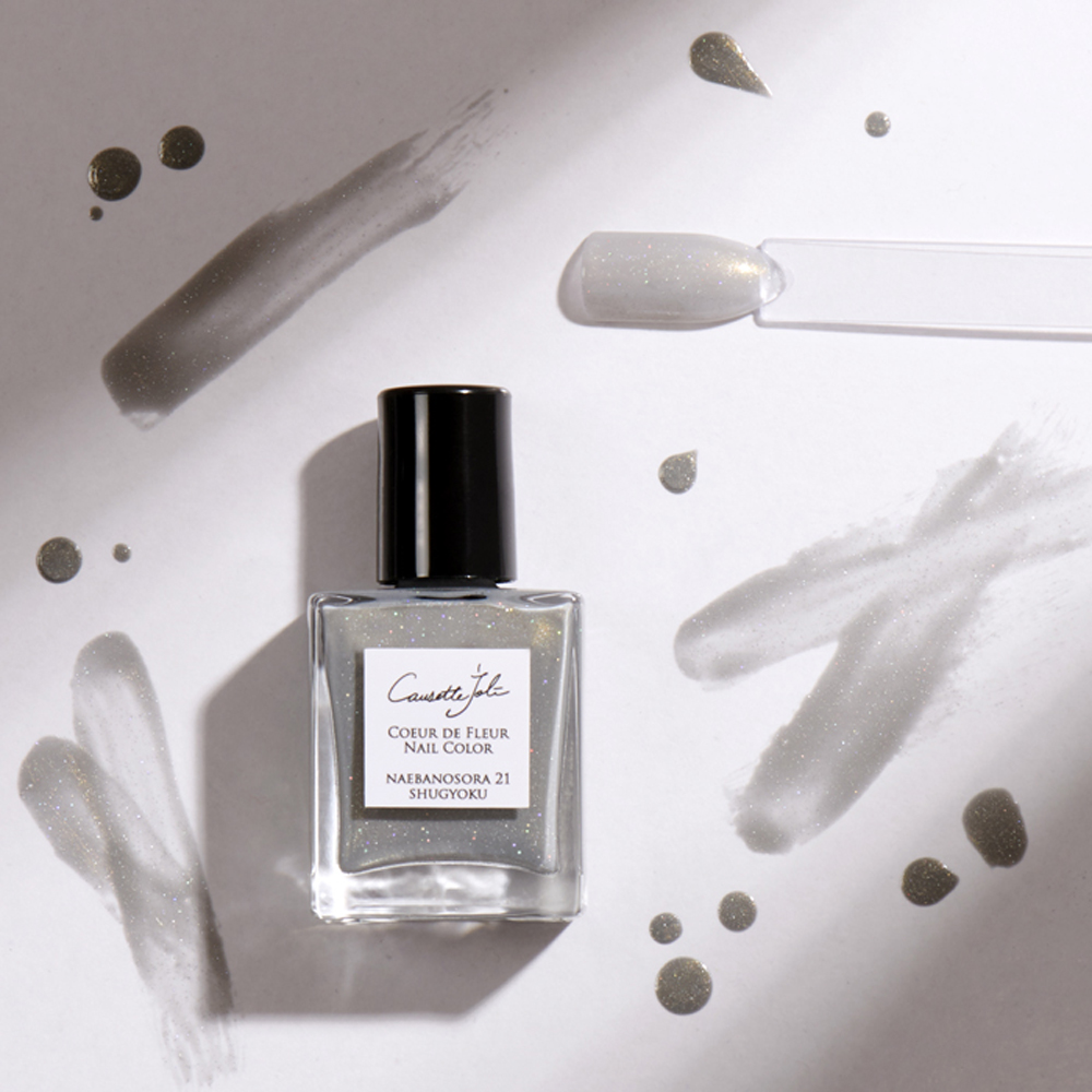 塗りやすく速乾性に優れており、トルエンやパラベンなどを配合していない健康に配慮した8大フリー製品。金色のヴェールを纏ったミドルグレーの「なえばのそら21しゅぎょく」は、一昨年の大雨からあけて、雲の晴れ間に虹が出る空をイメージして作成された。