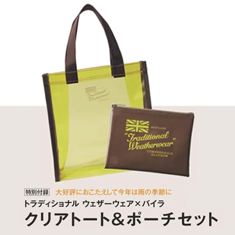 『BAILA(バイラ)』(集英社)2021年 7月号の付録は「トラディショナル ウェザーウェア クリアトート&ポーチセット」。毎年大好評のクリアなトートバッグが今年も登場。イエローとブラウンの組み合わせがクリア素材をグッと大人っぽくします。