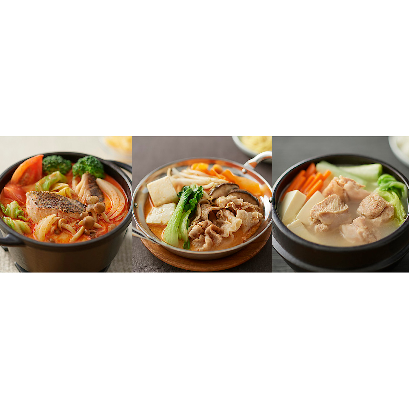 昨年まで展開していた「手づくり鍋の素」シリーズをリニューアルし、鍋スープを小分けタイプに。人気アイテムの「ビスク」や「胡麻味噌担々」などに、今季は「スンドゥブチゲ」と「台湾風豆乳スープ」が新たに加わり品揃えは全7種類。