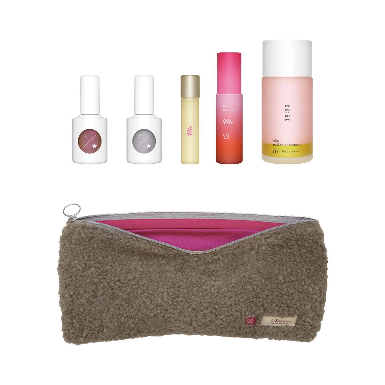 セット内容:uka nail oil me、uka kira kira study 1/kira or 2/kira、uka nail color remover 18:25、sanca×uka オリジナルポーチ付き