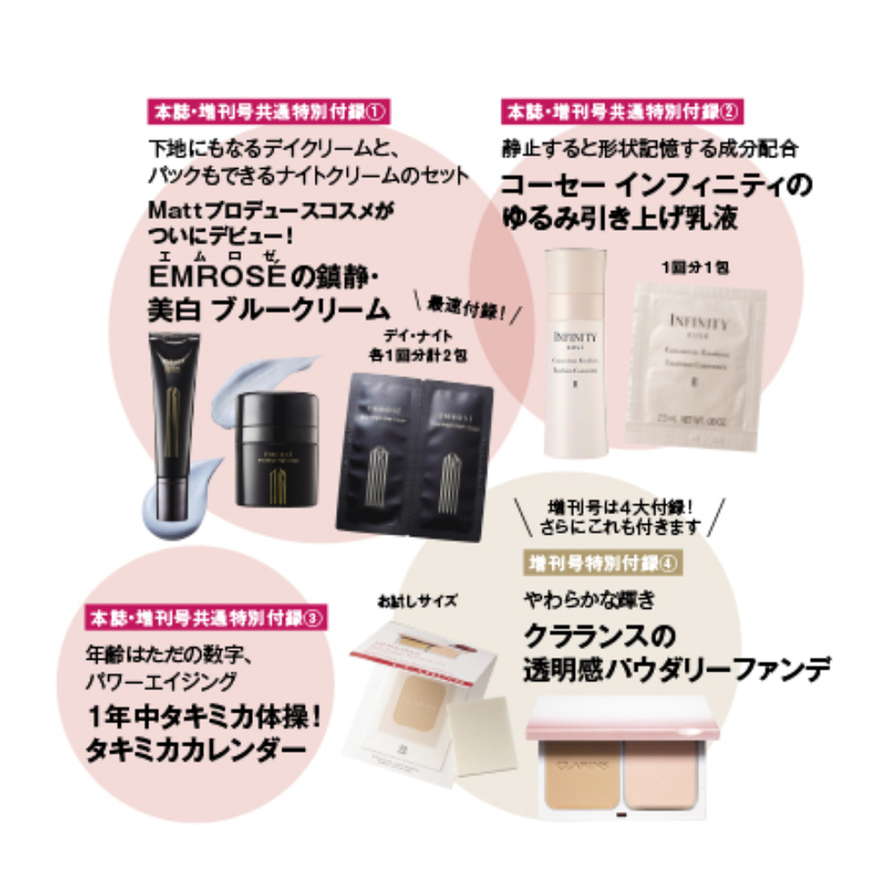 『美ST ビスト』(光文社)2022年1月号の付録は「EMROSE(エムロゼ)鎮静・美白 ブルークリーム、コーセー インフィニティ ゆるみ引き上げ乳液」です。EMROSEはあのMattプロデュースコスメ。下地にもなるデイクリームと、パックもできるナイトクリームのセットが各1回分計2包つきます。また、「コーセー インフィニティ ゆるみ引き上げ乳液」は静止すると形状記憶する成分配合した乳液。エイジングケアを考えている人におすすめのアイテムです。