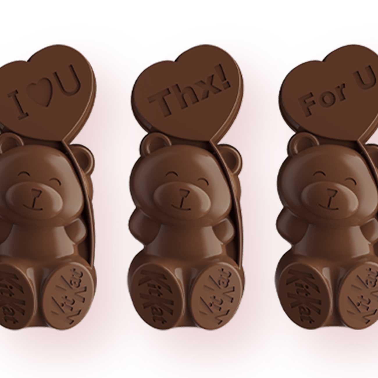 キャラクター型の特別なキットカットが世界中で発売されており、本商品は日本のバレンタインシーズンに向けた限定アイテム。クマ型のチョコレートの中にウエハースが入っており、味わいは通常のキットカットのままかわいい形に。クマが持つハート型の風船には「I♡U」「For U」「Thx」の3種メッセージが書かれている。