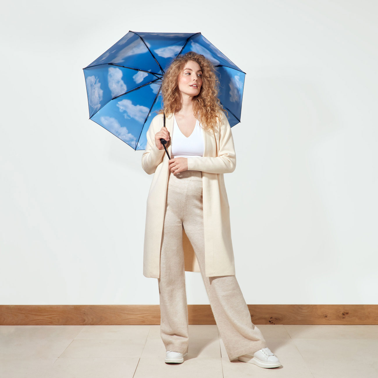 回収されたペットボトルを洗浄・粉砕して作られたリサイクルペット素材を使用し、通常のポリエステルよりも焼却時の二酸化炭素排出量を削減。内側に描かれた⻘空と⽩い雲が、雨の日も明るい気分にしてくれる。