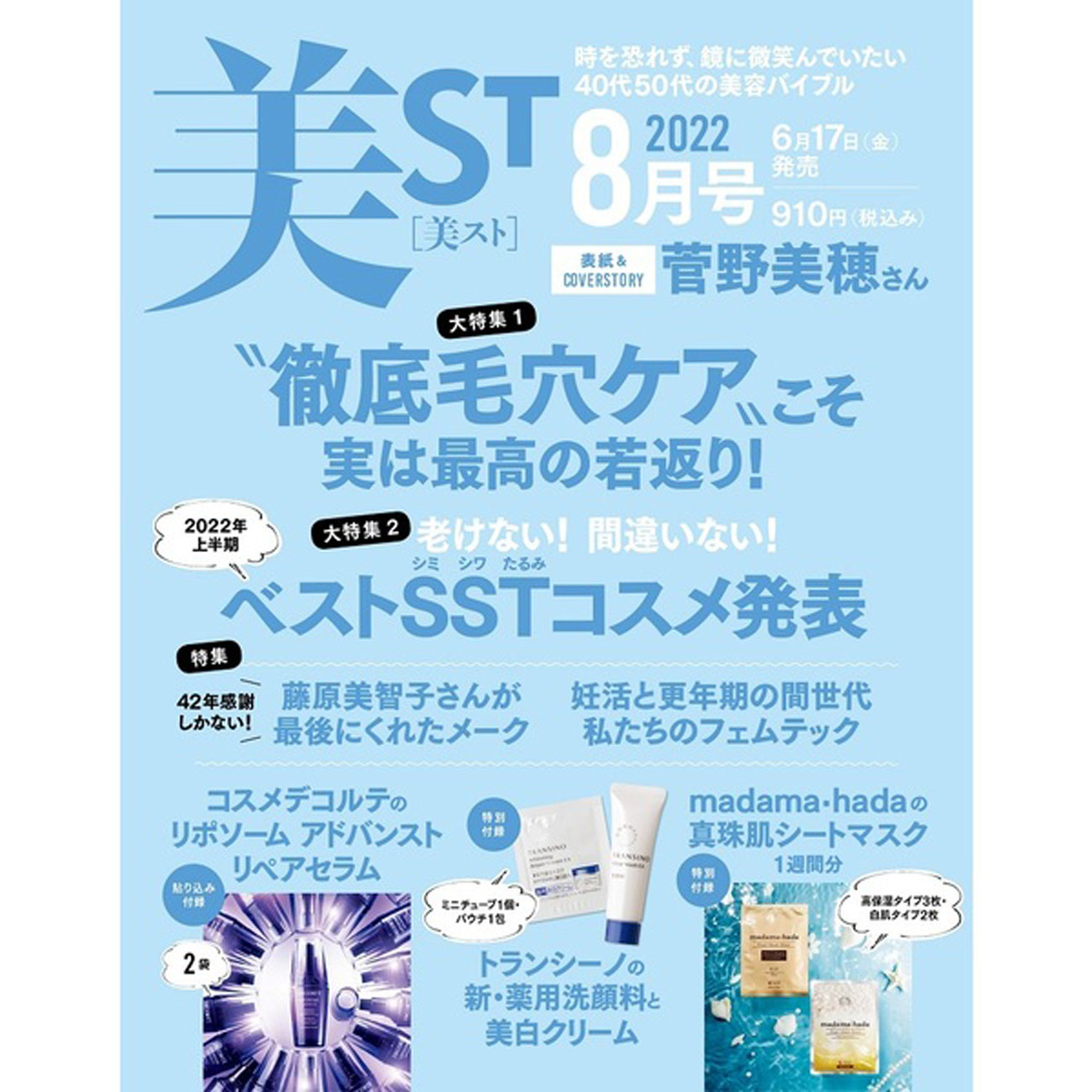 『美ST』(光文社) 2022年 8月号の付録は「コスメデコルテ リポソーム アドバンスト リペアセラム、トランシーノ 新・薬用洗顔料 約1週間分 + 美白クリーム他」。