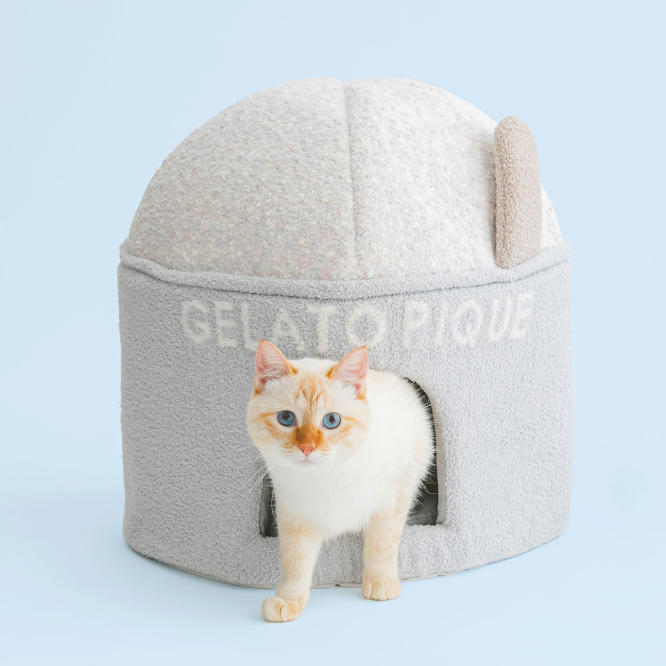 バニラをベースにストロベリーとソーダのつぶつぶが入ったカップアイスをイメージしたべビモコ素材のハウス。潜ることが好きな猫や、小型犬におすすめ。