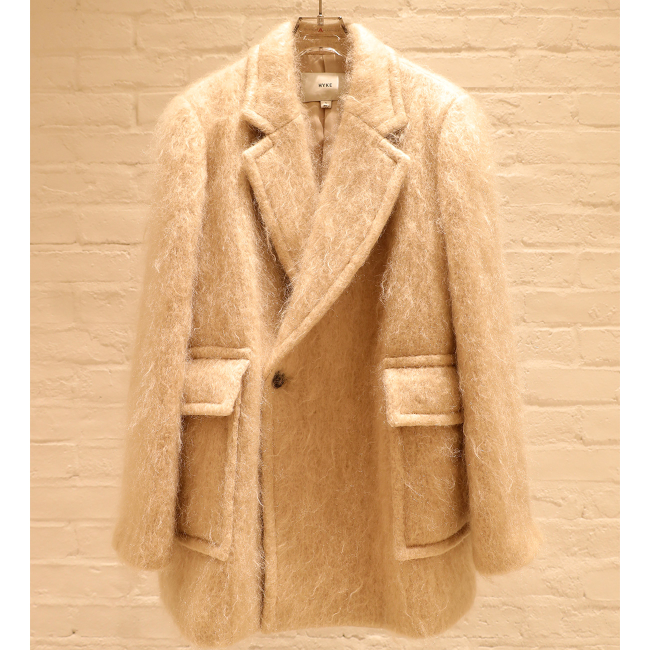 また、SUPER A MARKET別注「MOHAIR SHORT COAT」の販売をスタートする。22FWのコレクションで発表された「MOHAIR DOUBLE-BREASTED COAT」をショート丈で別注した。柔らかなベージュに毛足の長いモヘアが印象的なコートは、ショート丈にすることでコーディネートしやすい一着に仕上がった。