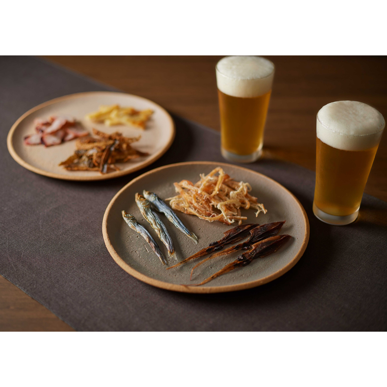 「鮭皮チップス」は北海道産の鮭を使用した鮭とばの加工時に裁断される皮の部分でできている。「ほたるいかのいしる干し」は、日本海沿岸で獲れたほたるいかを使用し、北陸地方に伝わる伝統的な魚醤「いしる」に漬けて干した。「皮つきさきいか」と「焼きうるめいわし」は国産素材を使用し、素材の旨味を生かして仕上げたという。