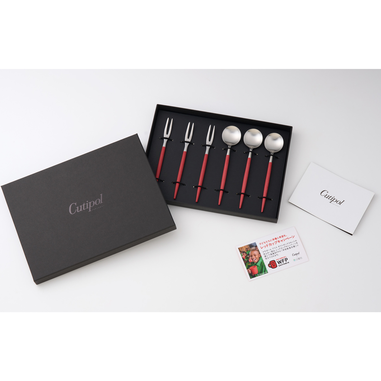 「ティータイムセットfor Red Cup Campaign」は、クチポールの人気シリーズ「GOA」のジャパニーズフォークとティースプーンが3本ずつ入ったティータイムやデザートの時間にぴったりのギフトセット。「レッドカップキャンペーン」に合わせて、鮮やかなレッドにシルバーとゴールドを組み合わせた2タイプを展開する。