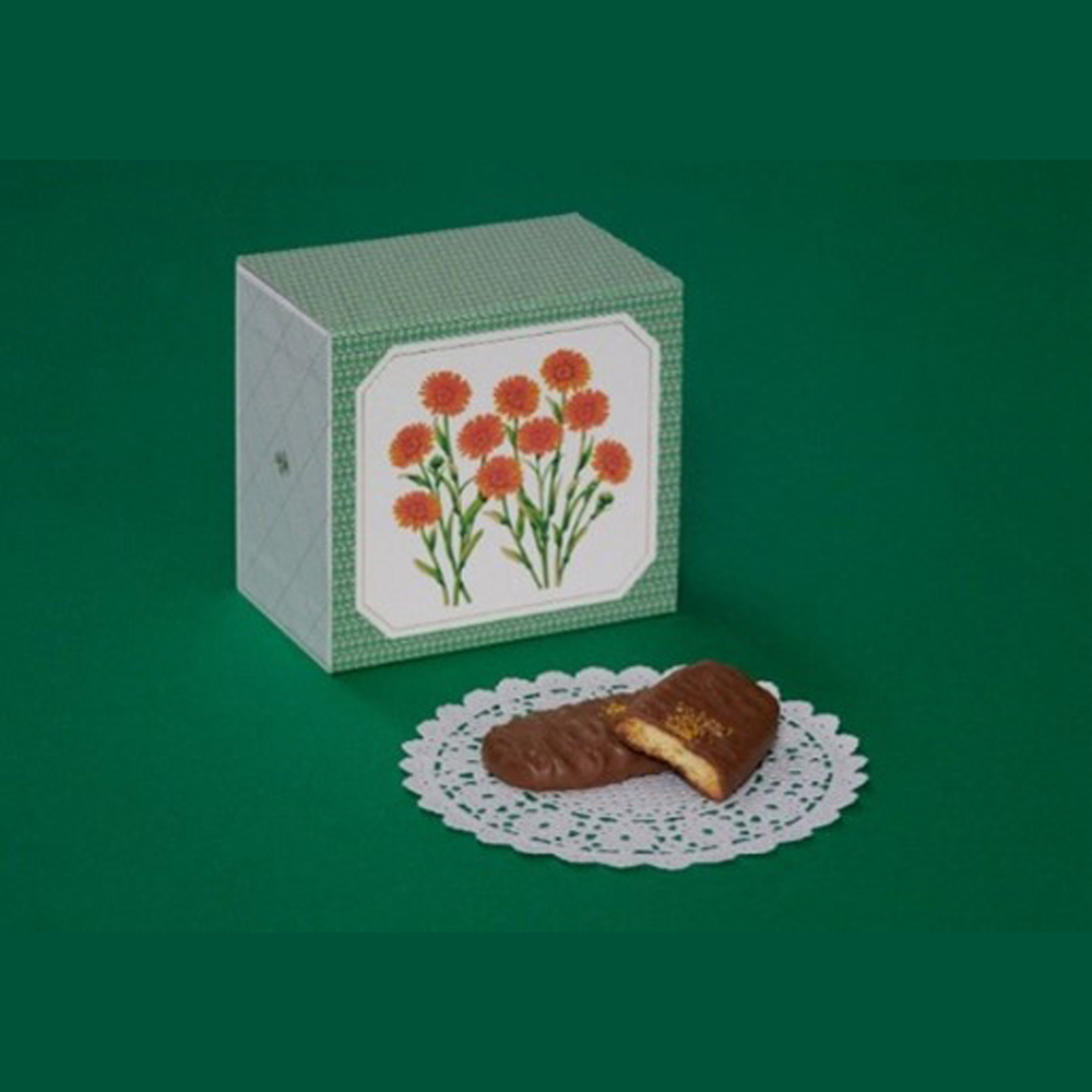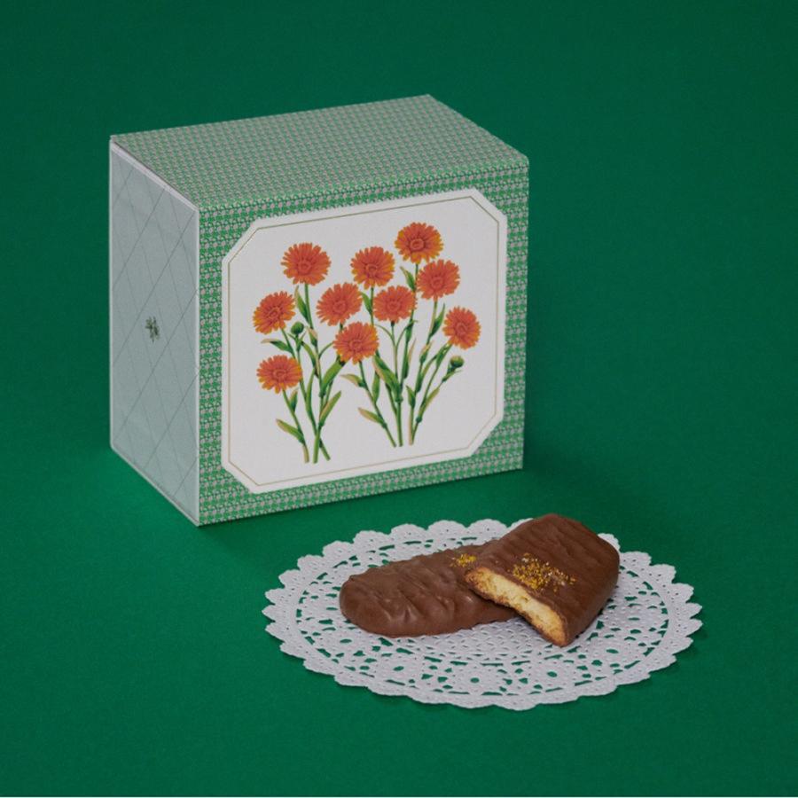バターを使用したクッキー生地にベルガモットのピューレとオレンジのパウダーを合わせて焼き上げた。フレッシュな香りのベルガモットと、相性の良いオレンジを閉じ込めたクッキーをミルクチョコレートで包んだショコラサブレ。