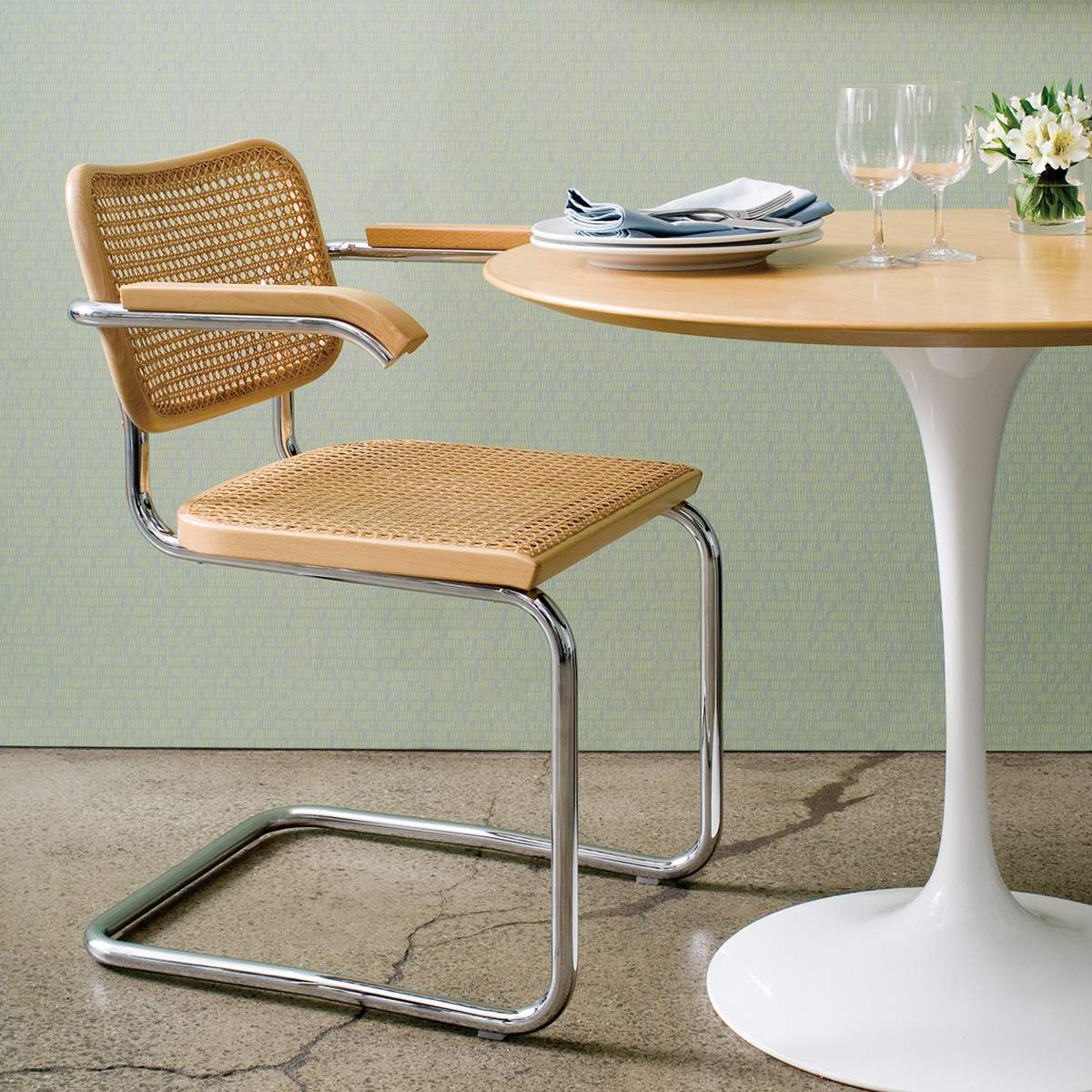 チェスカチェアは、伝統的な職人技と工業的な手法や素材を組み合わせ、モダンに仕上げたスチールパイプ製の椅子。スチールパイプ素材ならではの特性を利用したカンティレバー(片持ち)のフォルムが、柔軟性のある快適さを与える。ドイツの総合的造形教育機関・バウハウスの思想を反映した代表的なプロダクトの1つだ。