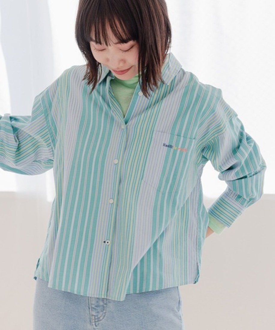 こちらのシャツはお笑いコンビ・ダイアンのユースケ扮する岸大介の衣装に似ていると一部ダイアンファンの間で話題に。ベースの色に様々なカラー、太さのストライプ柄をあしらっている。レイヤードや羽織りとしても使えるゆったりめのMサイズと、ショートサイズの2サイズを用意。