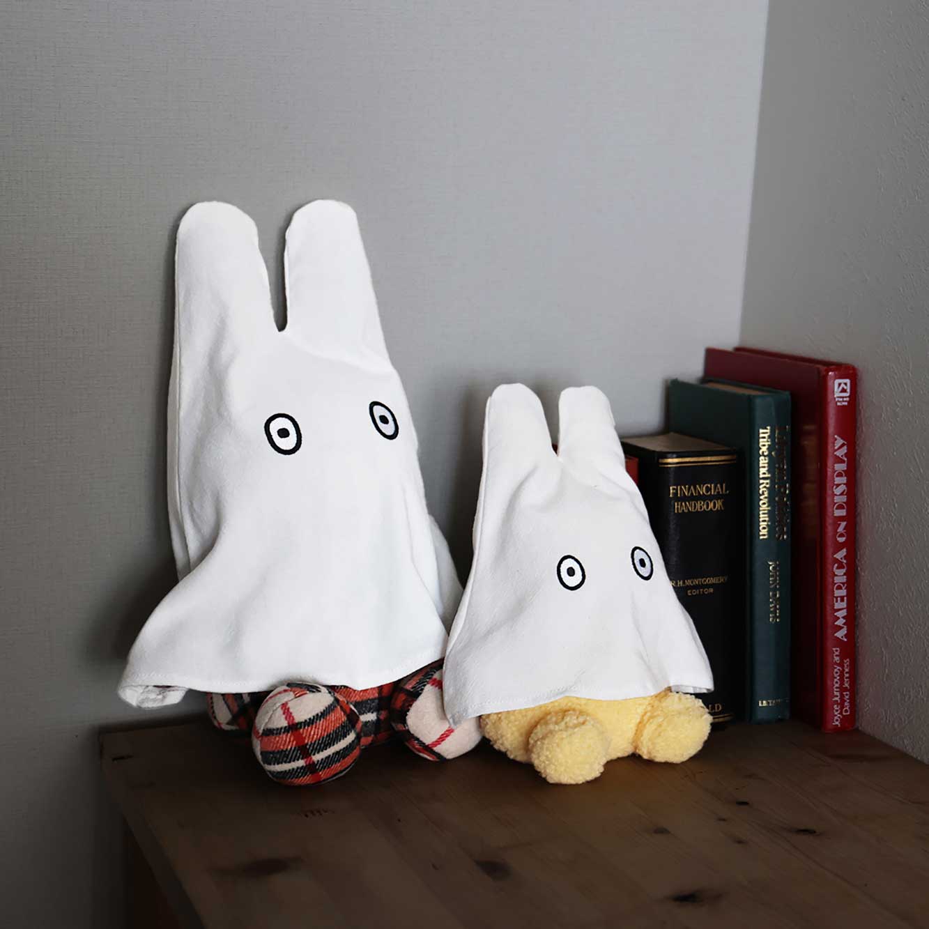 おばけミッフィーは2001年に発売された絵本『Miffy the Ghost』から登場した、シーツをかぶったミッフィー「おばけミッフィー」。BON TON TOYSのぬいぐるみの頭からシーツをイメージした布をかぶせ、絵本のおばけミッフィーを再現。