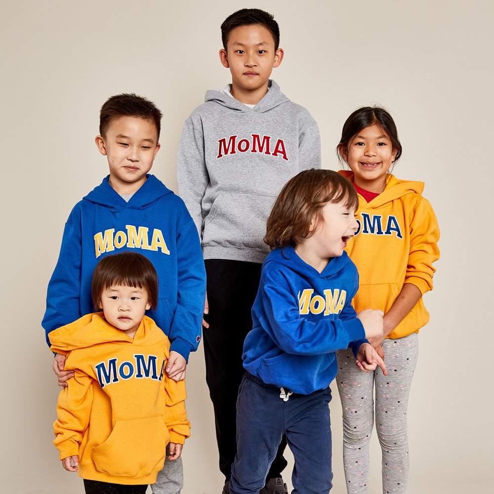 1930年代、トレーニング中のアスリートを暖かく保つために開発されたモダンなフーディーは、アスリートやカレッジスタイルの象徴に加えて、若者やストリートカルチャーにも取り入れられてきた。典型的なカレッジスタイル文字の「MoMA」があしらわれたフーディが、秋冬のキッズを温かく包み込む。
