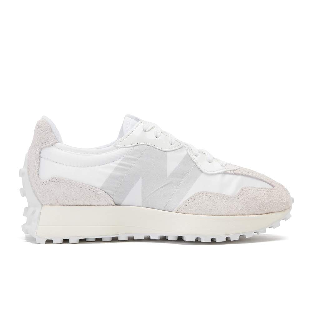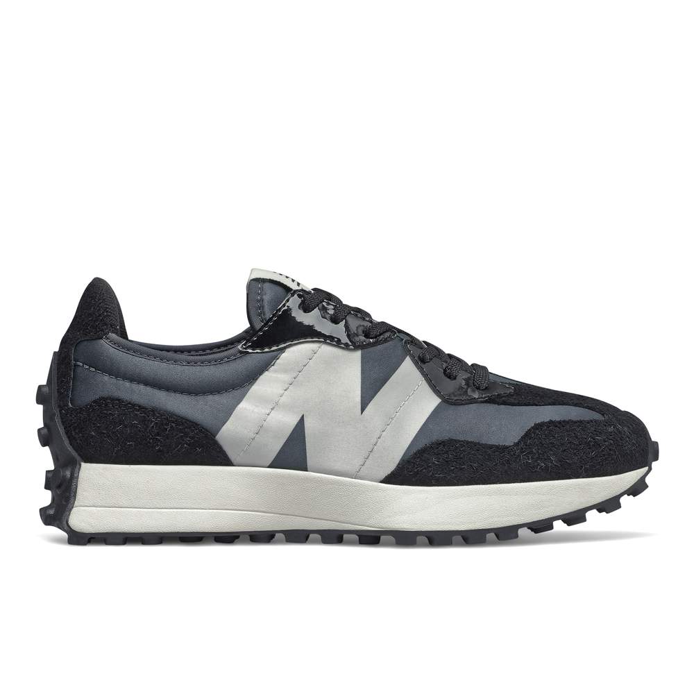 「327」は1970年代のニューバランスランニングシューズを代表する3つのモデルを元に生まれ、レトロな雰囲気がありながらも、今までのニューバランスにはなかった新鮮なデザインが特徴。ナイロン素材や爪先と踵部のアウトソールの巻き上げ、オーバーサイズのNロゴ、どのアングルから見てもフレアなミッドソールが存在感を放っている。