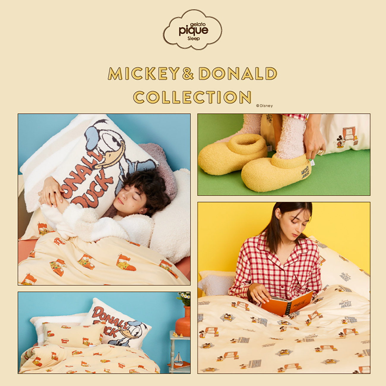 コミックアートからインスピレーションを受けて表現した「ミッキーマウスとドナルドダック」が主役の新作コレクション。ヴィンテージ感のあるカラーやお部屋やベッドで過ごすミッキーマウスとドナルドダックのキャッチーなアートがかわいらしい。総柄のベッドリネンから、ふわふわ、もこもこのマルチカバーやピローケース、立体感にこだわったニット雑貨など計12型が登場する。