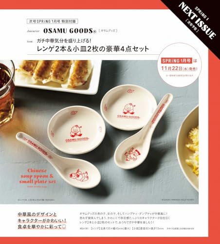 『SPRiNG(スプリング)』(宝島社)2024年1月号の付録は「オサムグッズ(R) ガチ中華気分を盛り上げる! レンゲ2本&小皿2枚の豪華4点セット」です。メラミン樹脂素材は、軽くて熱さに強いといのが大きな特長。小皿はしょう油皿やレンゲ受けとしてもちょうどいい大きさです。