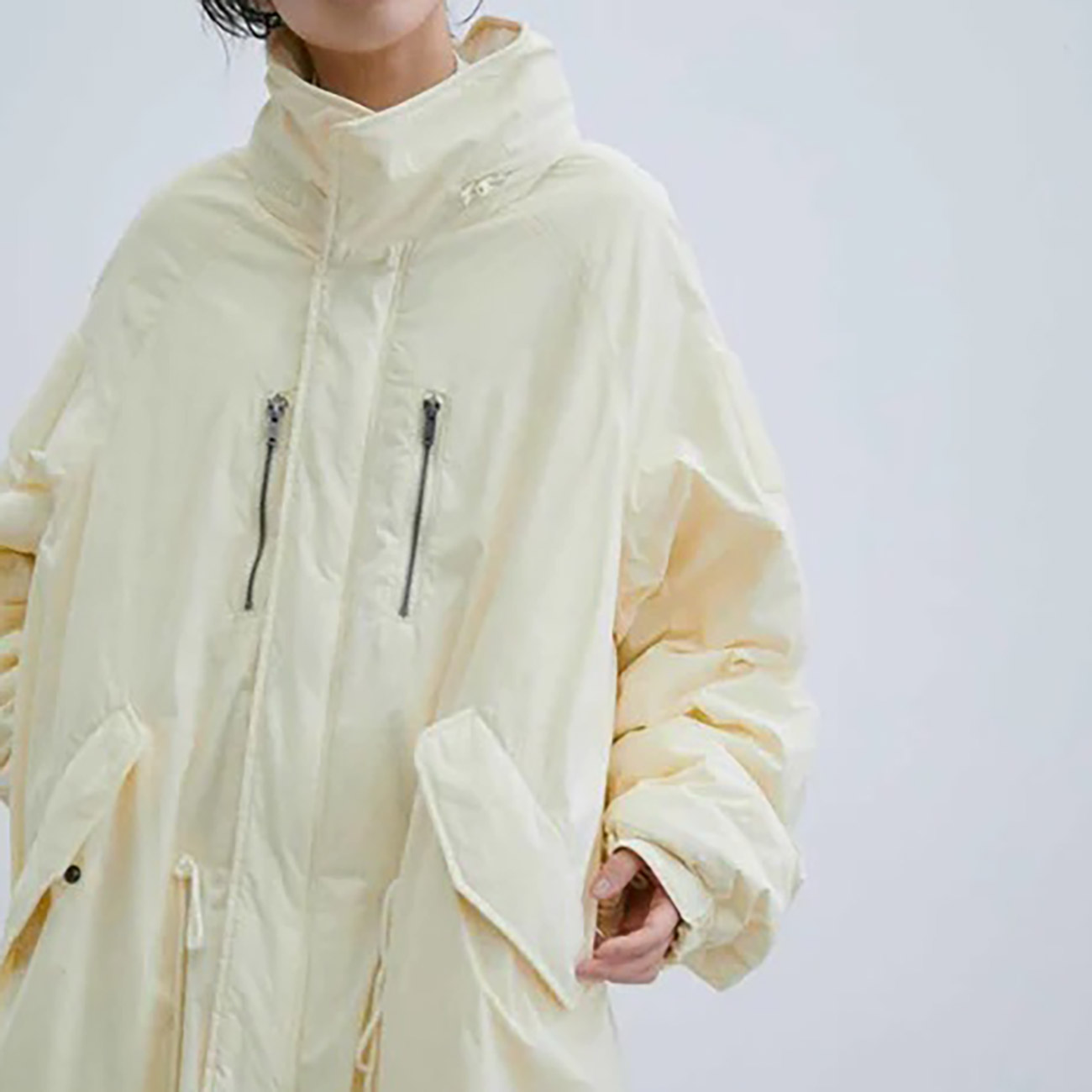 モッズーコートをより街中で着やすいよう、アップデートした一着。完全オリジナルのパターンで製作し、ポケット内にあるアジャスターを引っ張りウエストを絞ることでビッグシルエットに変化を加えることができる。