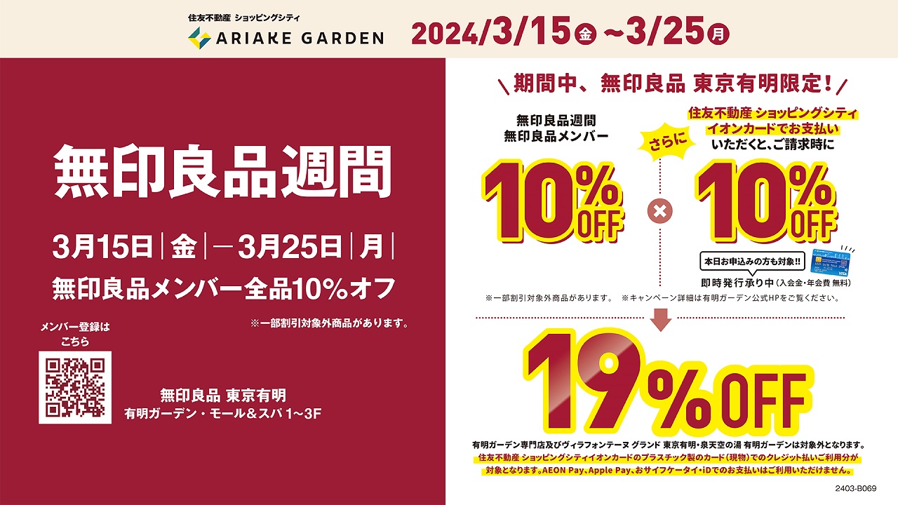 無印良品の旗艦店の1つ「有明ガーデン店」では特別なキャンペーンを実施。「住友不動産 ショッピングシティイオンカード」で支払うとさらに10%オフになり、合計で実質19%オフになる。