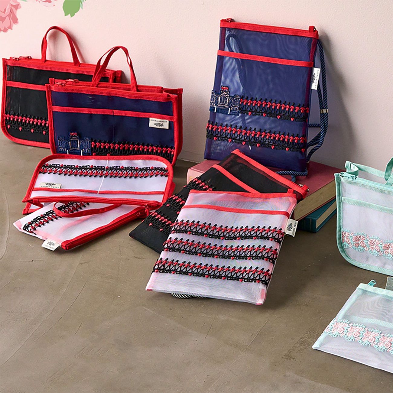 第2弾はローラ アシュレイの人気モチーフがかわいらしいメッシュ素材バッグインバッグ、ポーチ、サコッシュをラインナップ。