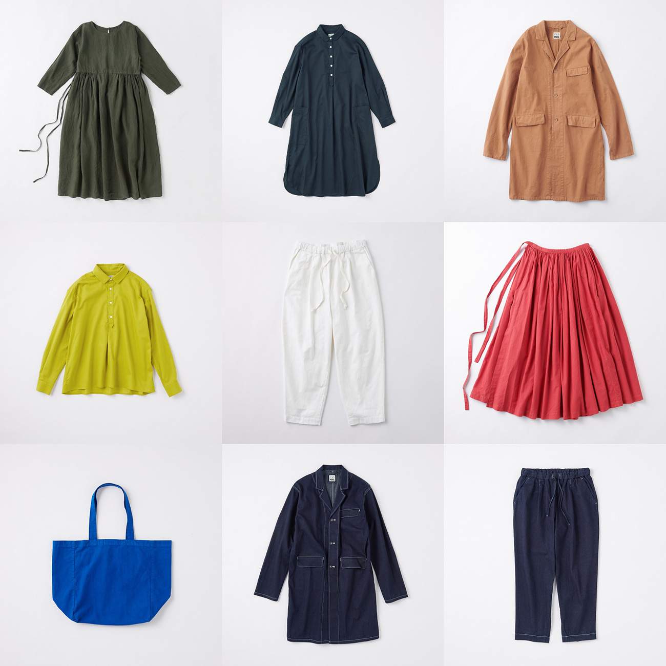 2020年秋冬コレクションでは、シーズンカラーとして「レッド」、「ロイヤルブルー」、「イエローグリーン」の3色を設定し、それらを含む7色をラインナップ。定番のリネンのほか、カーテン用綿ツイルの残反、岡山デニムの残反、老舗ニットメーカーの残糸などを使用したアイテムが揃う。トートバッグ3000円~。