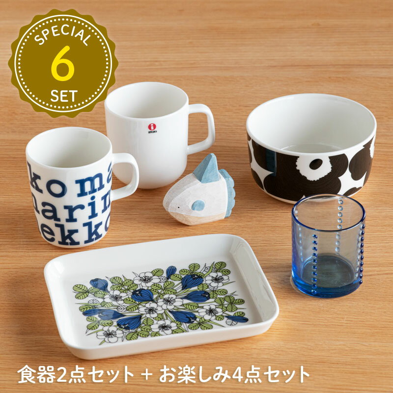 iittala(イッタラ)、ARABIA(アラビア)、marimekko(マリメッコ)の食器2点セットに、その他人気ブランドアイテムを4点プラスした計6点のお得なセット。食事やティータイムなど、食卓を華やかに彩る素敵なセットになっている。