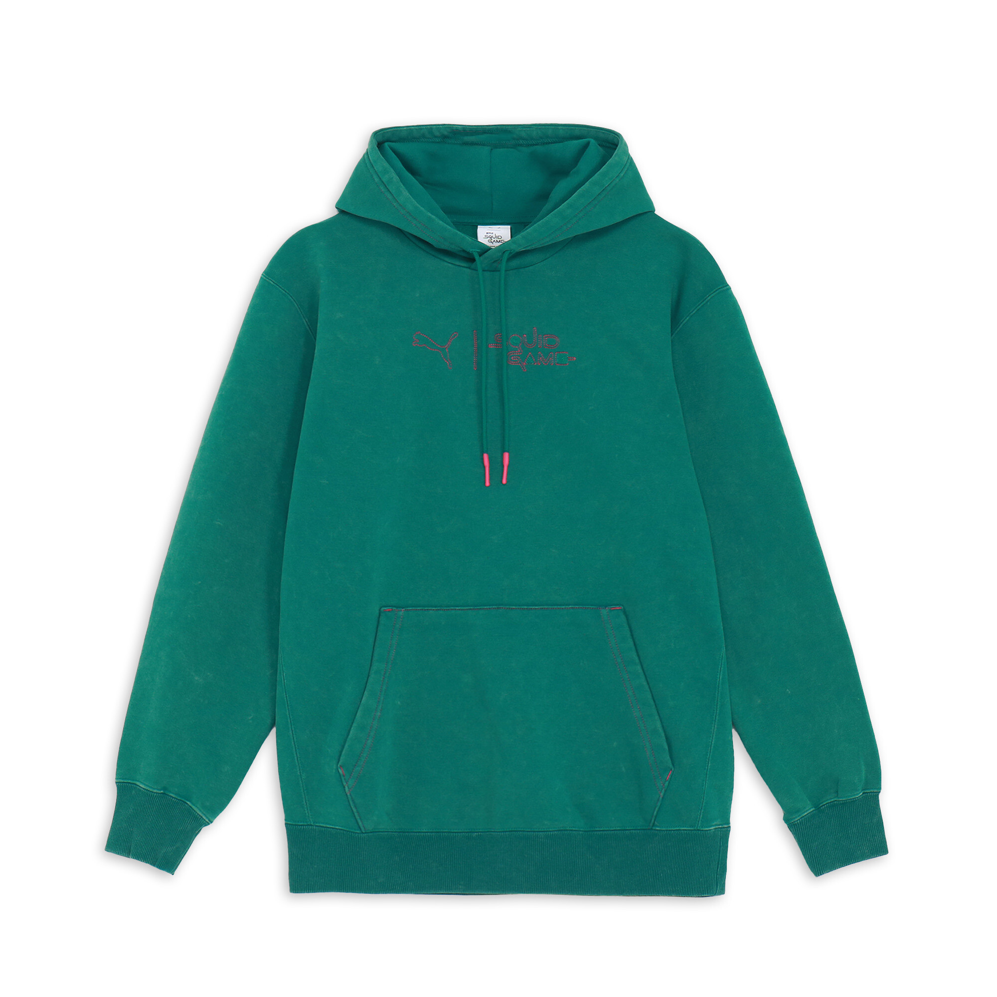 プーマのアイコニックなT7トラックジャケットとT7トラックパンツは、劇中で印象的に描かれている階段迷路をモチーフにしたカスタムパターンでリメイク。出場者が着用する緑のユニフォームを彷彿とさせるこのトラックスーツは、ベルベット素材で作られ、プーマキャットとイカゲームのロゴが施されたチェストラベルや、特別デザインのタグを施した。