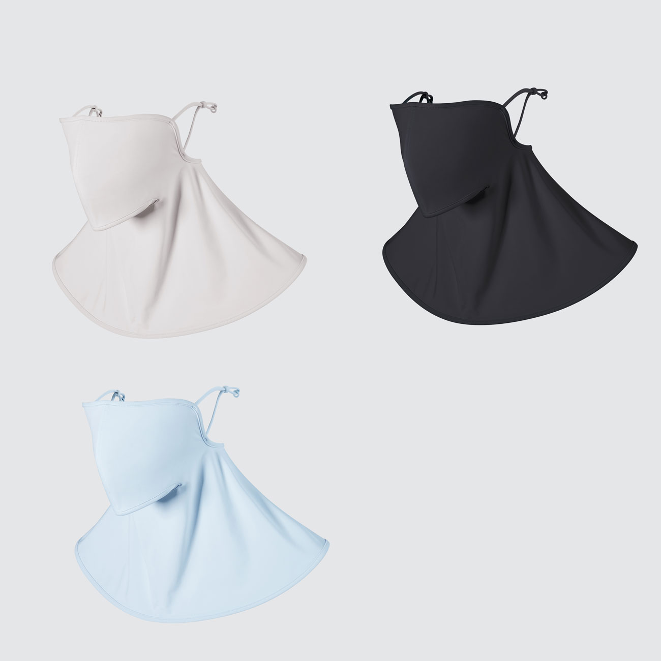 接触冷感のエアリズム素材で、吸汗速乾、肌面平滑性、消臭機能も搭載。マスクとネックカバー部分は呼吸しやすく、耳元はアジャスターで調整可能。暑い日の外出やスポーツに最適です。