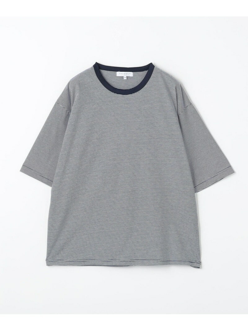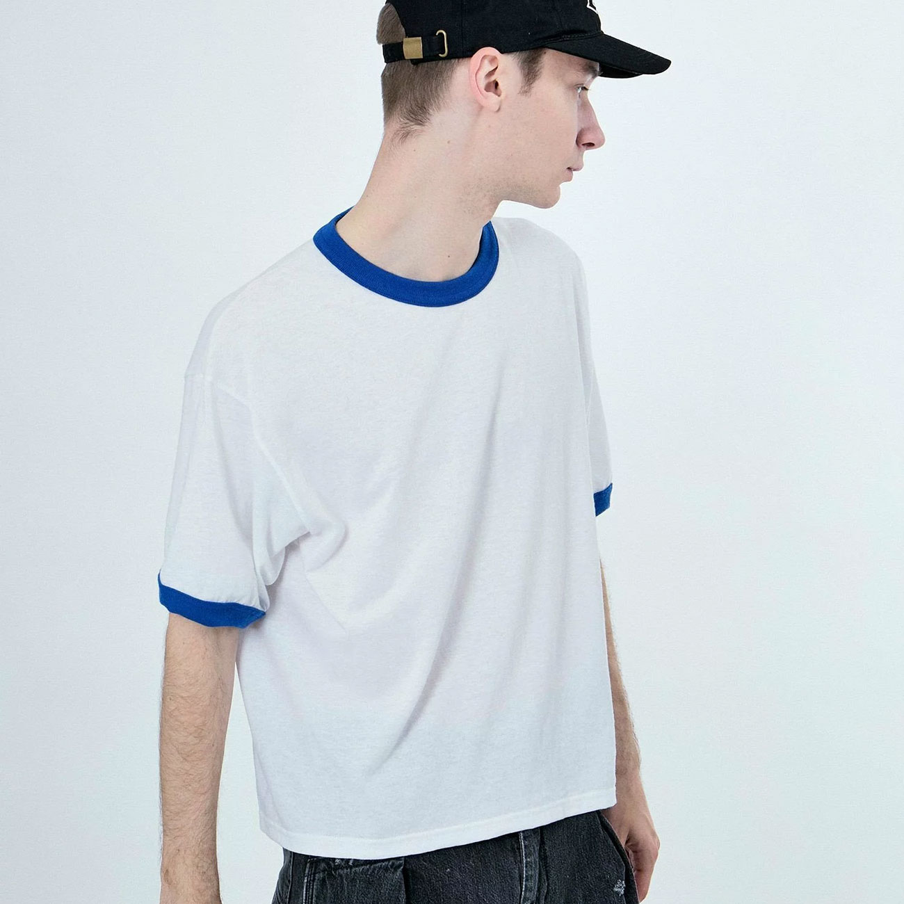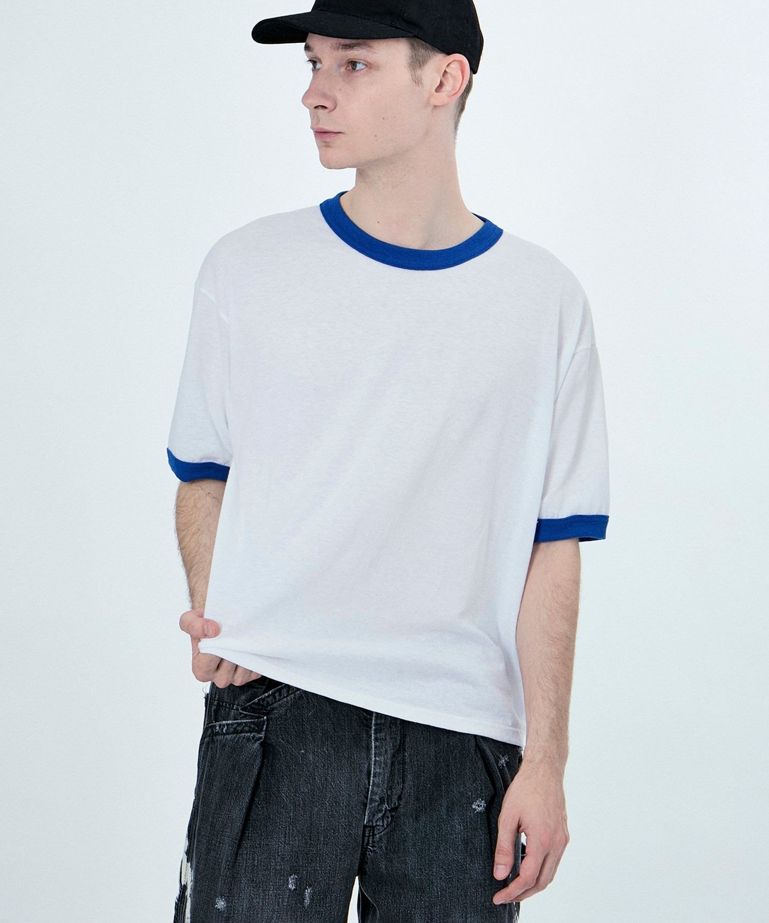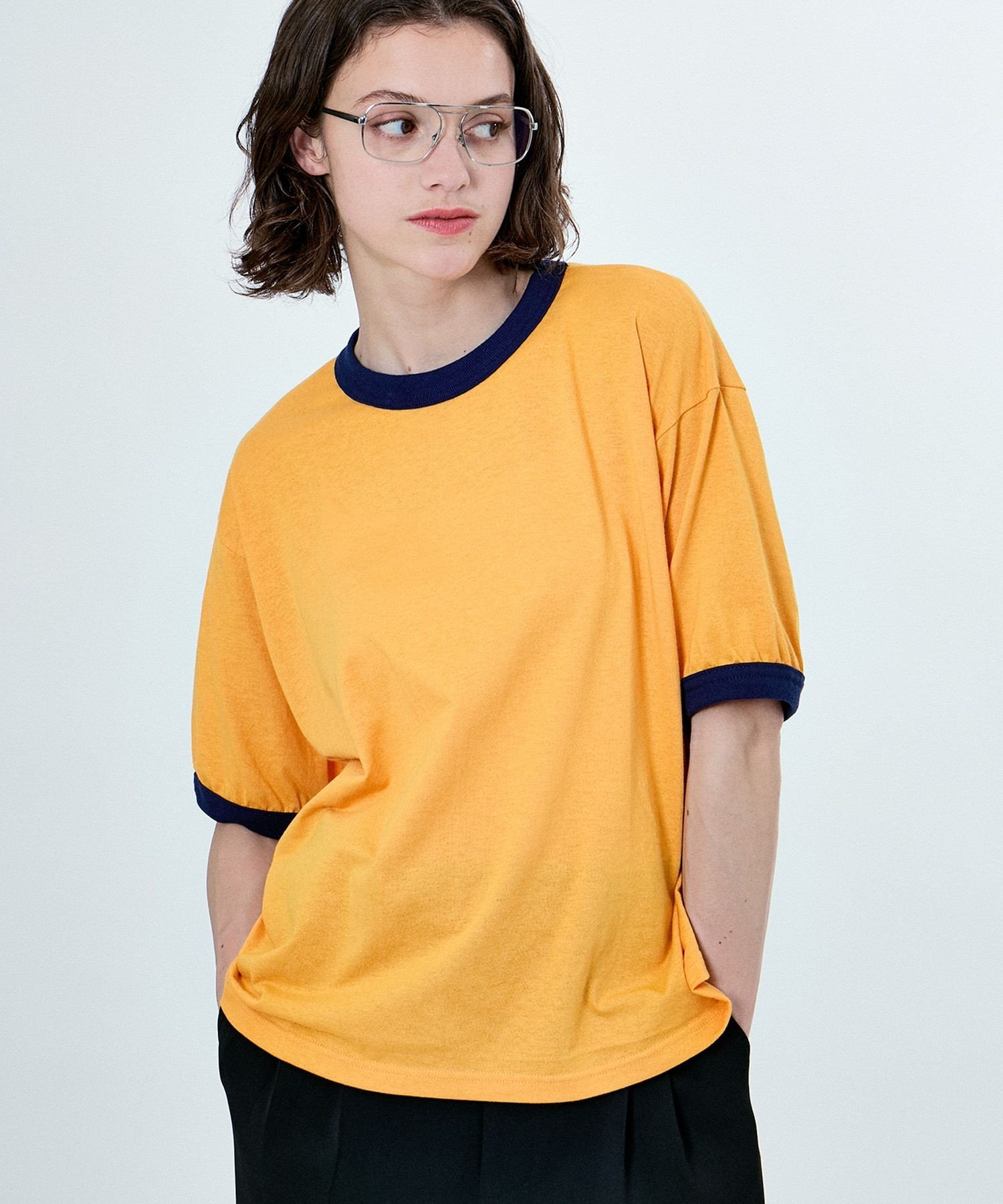 バランスが良く見える絶妙なジャスト丈が魅力的な一枚。首元と袖口にトリミングが施されており、ヴィンテージTシャツのようなレトロな雰囲気を演出します。