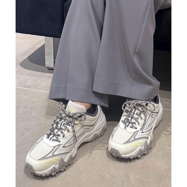 カラーリングはemmiらしいクラシカルで柔らかな色合いを採用。クリアなアイボリーとネイビーをベースに、ポイントでシルバーとベージュが配されており、上品で落ち着いた印象を与えます。通常のFILAモデルとは一線を画す、大人な一足に仕上がりました。
