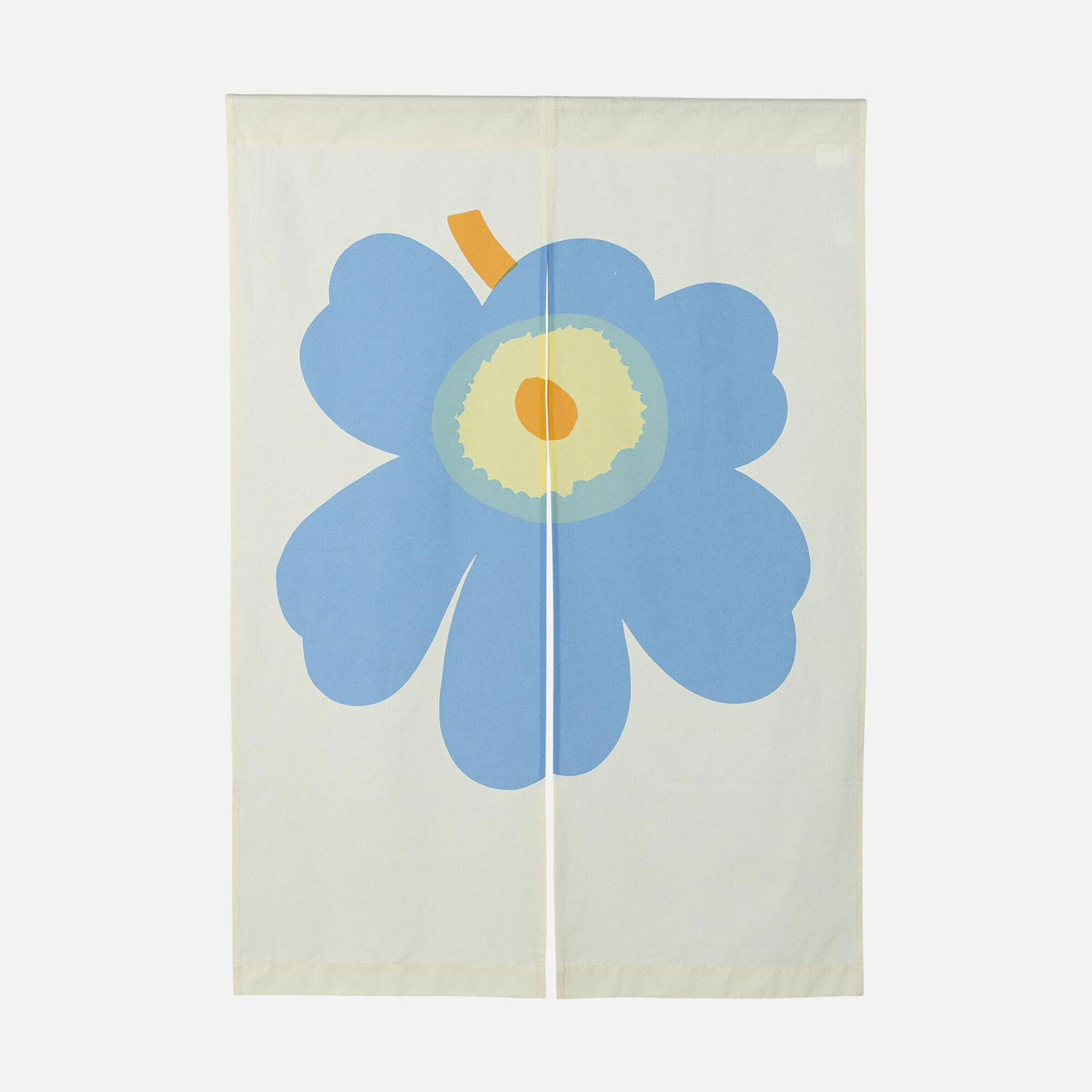 生成りのコットン生地をベースに、爽やかなスカイブルーと温かなライトイエローのウニッコ柄が中央に描かれています。サイズは高さ118cm×幅83cmで日本家屋からモダンな空間まで幅広い雰囲気のお部屋に溶け込みます。