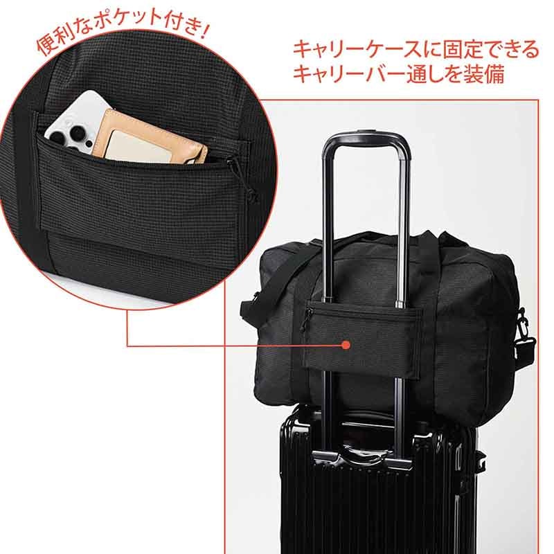 軽さと耐久性を両立させたリップストップ生地を使用しており、たっぷり荷物を入れても安心。旅行やアウトドア、ジムなど様々なシーンで大活躍するサイズ感。取り外し可能なショルダーストラップや、スーツケースに固定できるキャリーバー通しが付いており、機能面も充実しています。