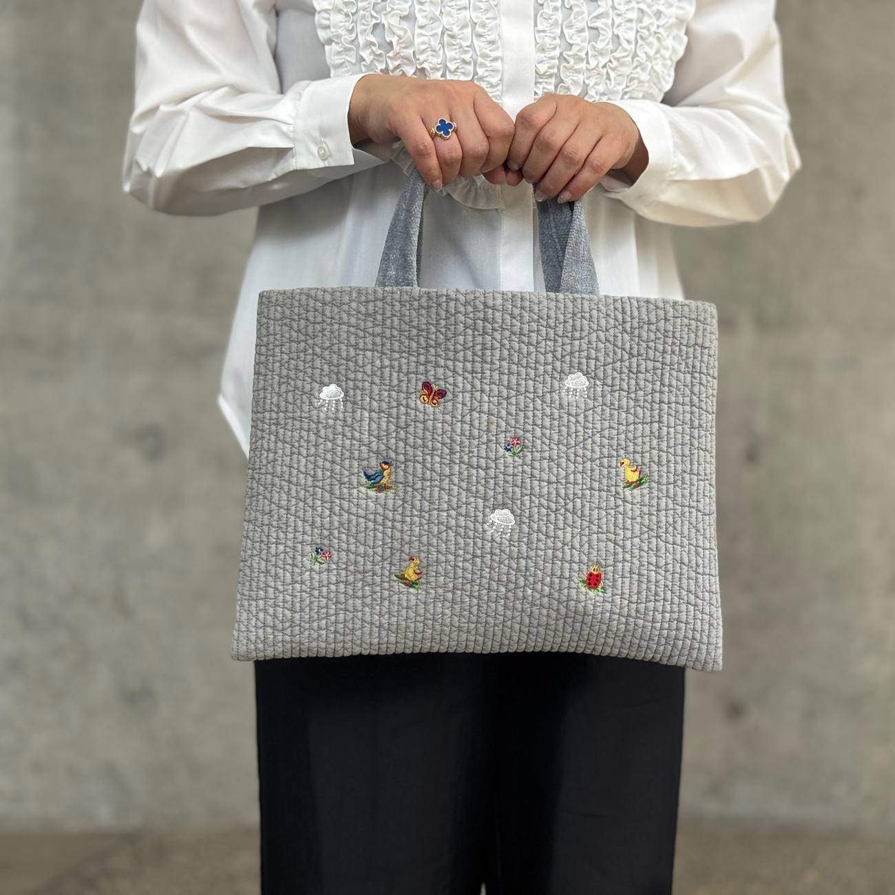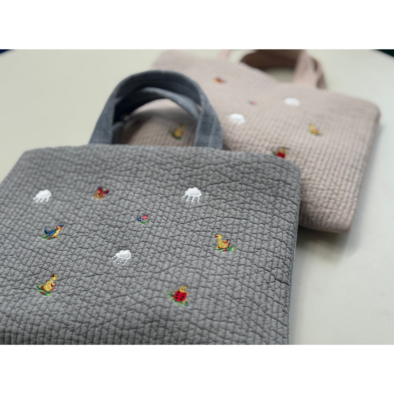 片面はピオヌンナルらしいキルティングのようなヌビ生地に、雲と雨のオリジナル刺繍。もう片面にはシュニール織を採用し、フェイラーの人気柄「ハイジ」のアヒル・テントウムシ・蝶々・青い鳥・花のモチーフを施した、両ブランドの伝統と魅力が融合した唯一無二のバッグに仕上がっています。