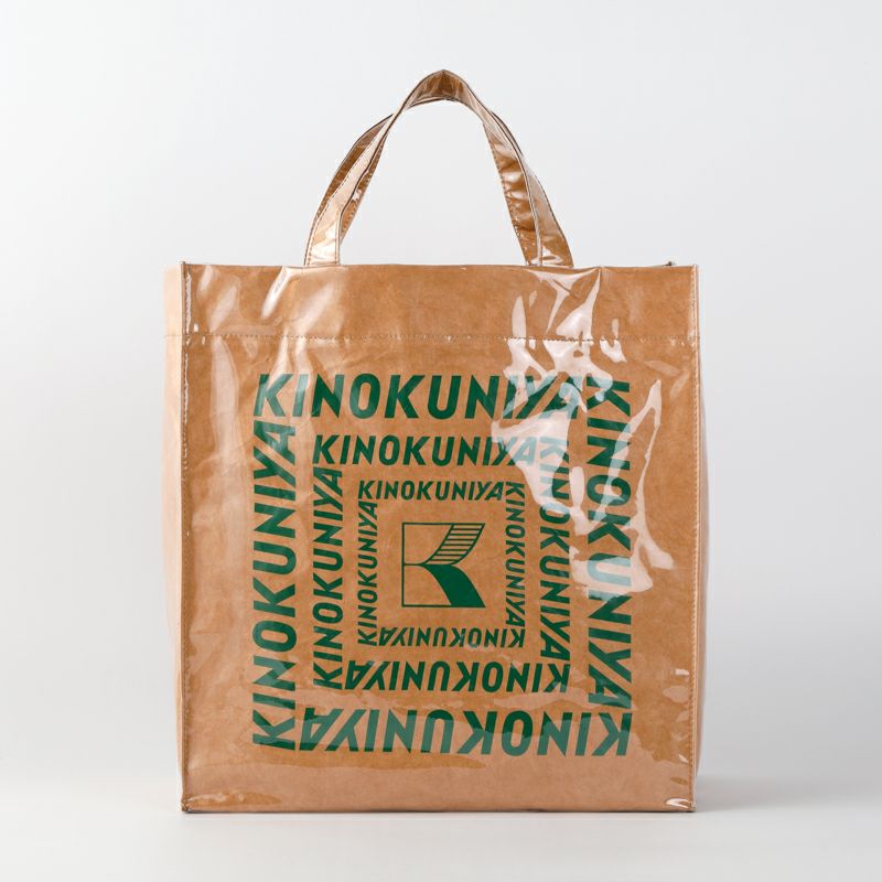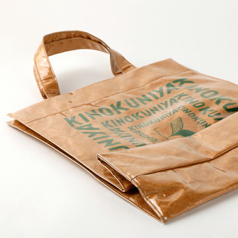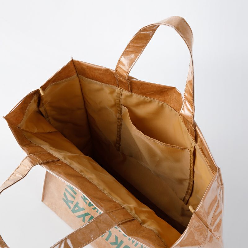 外側は光沢感のあるビニール素材、内側は紙袋のような風合いの素材を組み合わせたユニークなデザインを採用。紀ノ国屋の紙袋を思わせるルックスでありながら、雨や汚れを拭き取れる高機能性も両立。急な雨の日でも安心して使えます。
