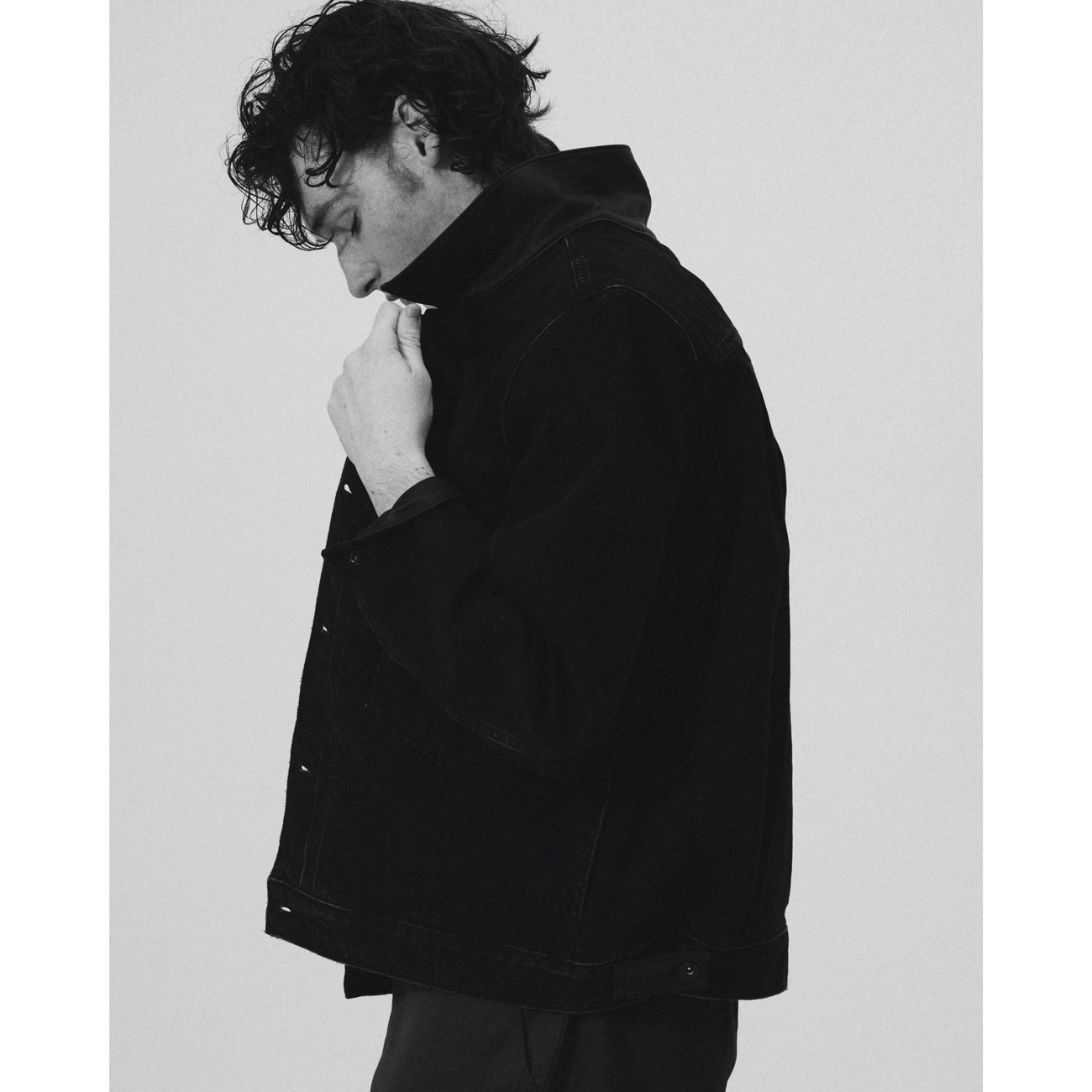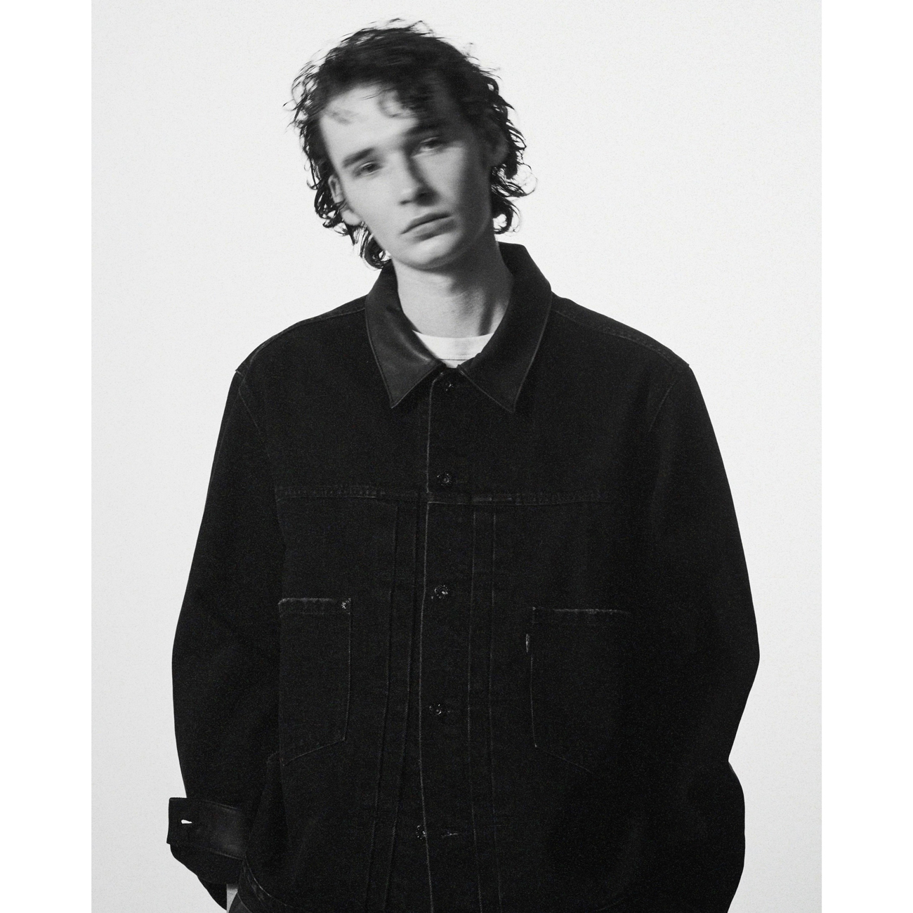 この別注ジャケットの最大の特徴は、襟、サイドアジャスター、袖カフス裏の3箇所に柔らかなラムレザーを採用している点です。これにより、タフなデニムジャケットに上品なアクセントと、奥行きのある表情を加えました。