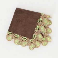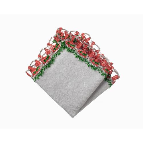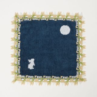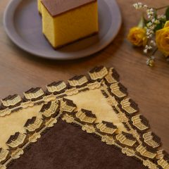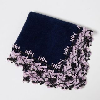 このハンカチはイタリアにもアメリカにもない、1940年代に横浜のホテルニューグランドで考案されたナポリタンの発祥ストーリーを背景に持ちます。フォークに絡んだ麺の一本一本、そしてレトロなフォントの「ナポリタン」の文字を、近沢レース店の熟練の技術で細やかに表現しています。