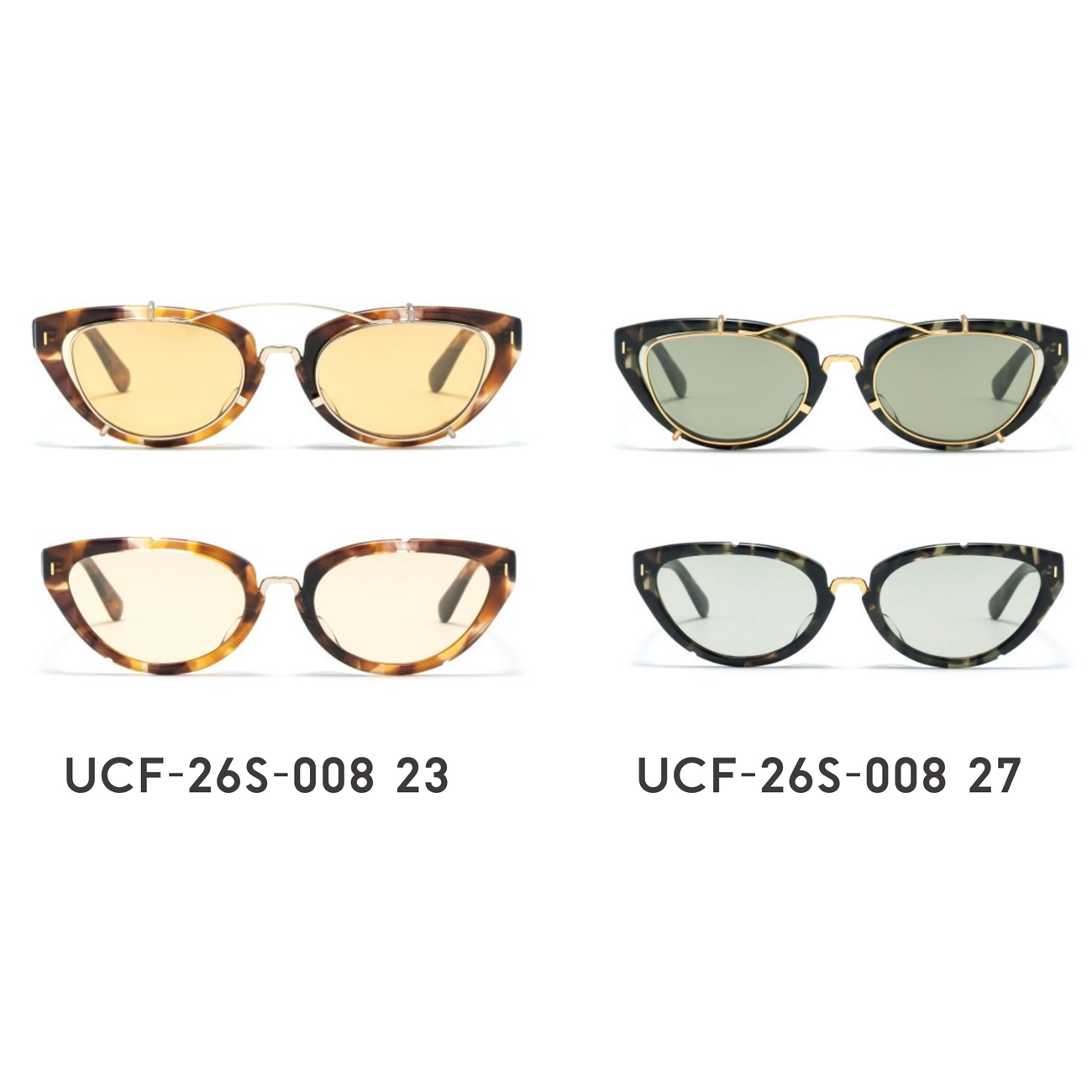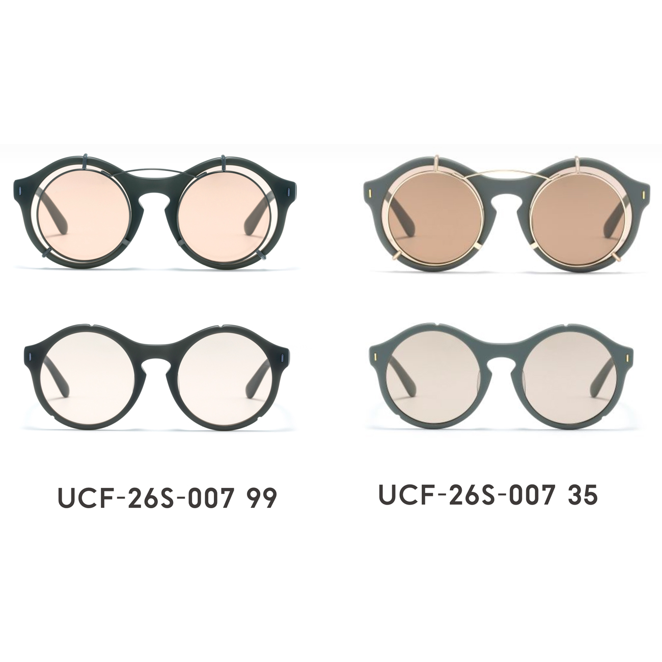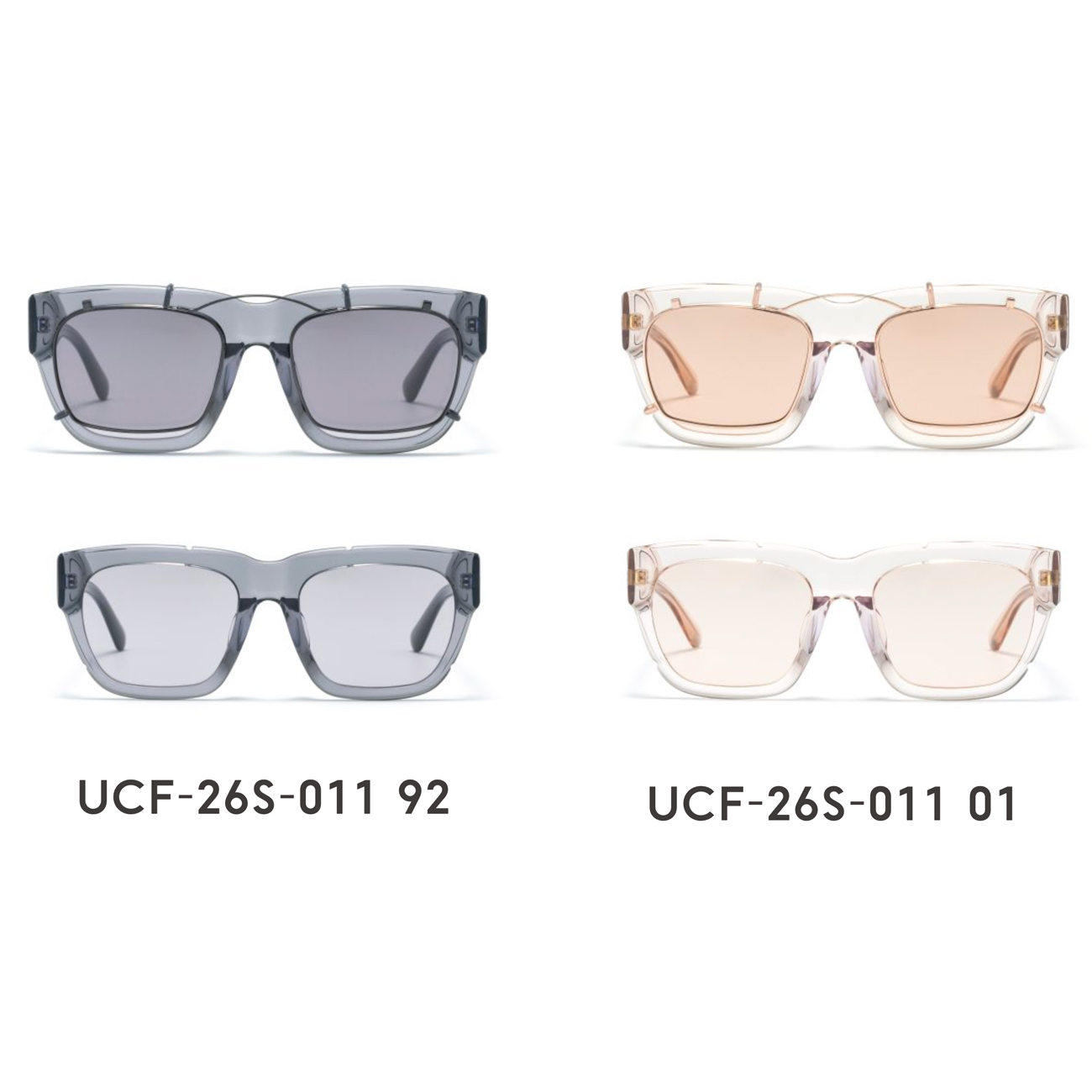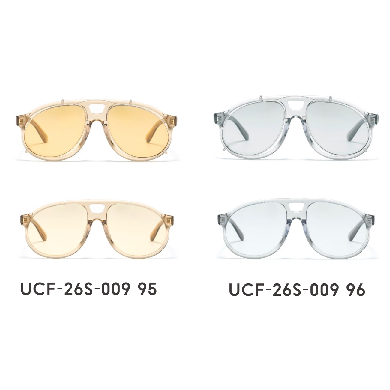 クリアレンズのメガネフレームに、デザイン性の高いカラーレンズのクリップオンパーツを組み合わせたユニークな構造が特徴です。通常のクリップオンサングラスが持つ実用性だけでなく、ファッションとしての楽しさを追求し、クリップオンパーツをあえて大きめに設計することで、顔周りに斬新なアクセントをもたらします。