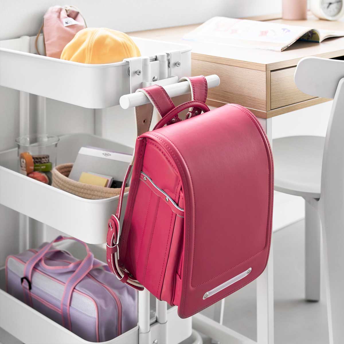 子どもの片付けを習慣化する、スチールワゴン横ランドセル&リュックハンガーです。