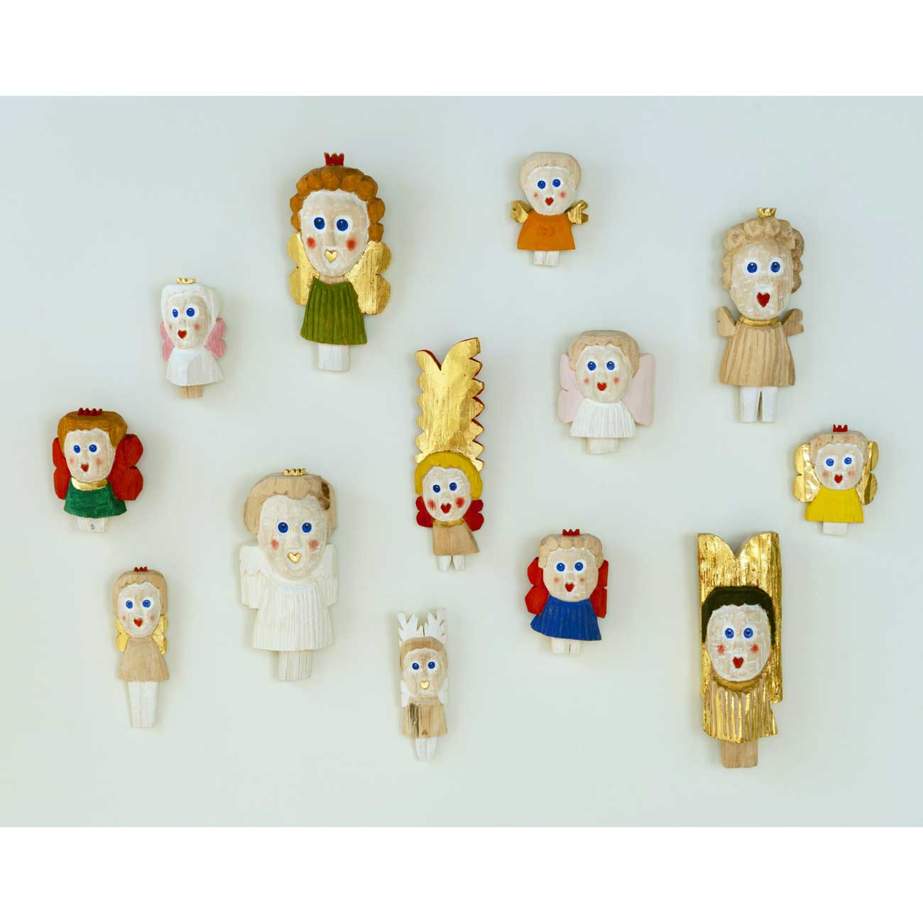 スウェーデンの美術作家 ・Sverker Eklund(スヴェルケル・エークルンド)が制作する天使は、神秘的というよりどこか愛らしさを感じる彫刻作品。娘の誕生をきっかけに木材での人形作りをスタートしたといい、1年以上乾燥させた丈夫な木を斧とノミだけを使い、全て手彫りで制作。色づけは、中世の美術絵画などで油絵具よりも以前に使われていたテンペラという伝統的な塗料を、金色は23Kの金箔を使用している。